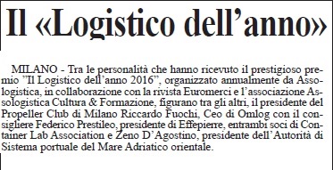 Il Consigliere del Propeller Federico Prestileo, Presidente di Effepierre, insieme al Presidente Riccardo Fuochi, entrambi Soci di Container Lab Association, hanno ricevuto venerdì 25 novembre da Assologistica il prestigioso premio “Il Logistico dell’anno 2016″.